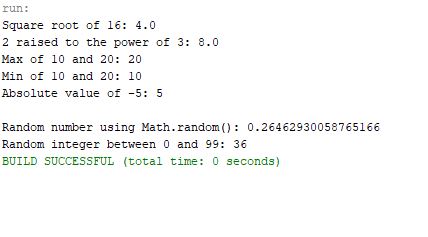 System.out.println("2 raised to the power of 3: " + Math.pow(2, 3));